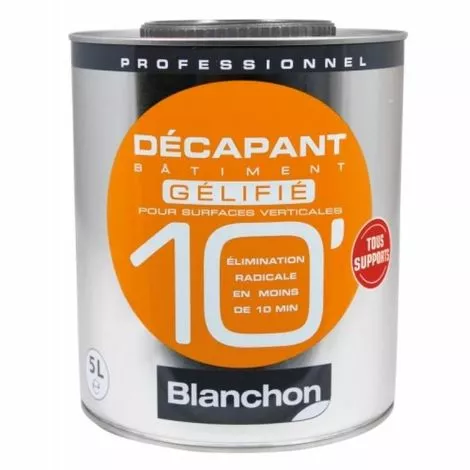 Décapant et décollageDécapants bâtiment 10′ gélifiés Élimination radicale des peintures, vernis, lasures glycéros et acryliques en moins de 10 mn. Tous supports extérieurs/intérieurs (bien ventilés) : bois, métaux, verre, béton… Ne pas appliquer su Fabrication Française