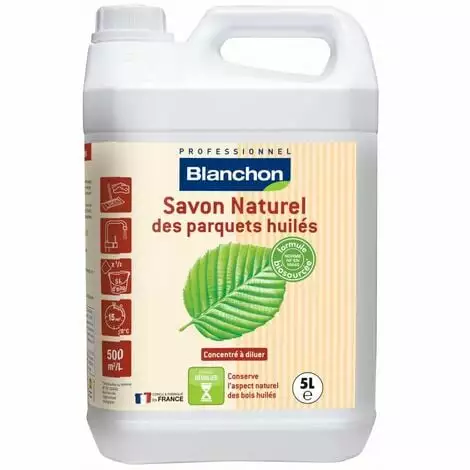 Savon naturel pour parquets huilés Blanchon, incolore, bidon de 5 litres.